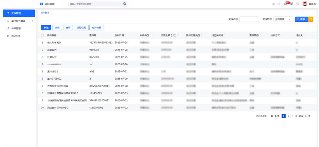 案件登记:此功能允许用户基于案件表单定制案件提醒、任务分配和统计分析。这有助于跟踪案件进度,确保所有相关任务按时完成,并提供案件处理的可视化数据支持决策。