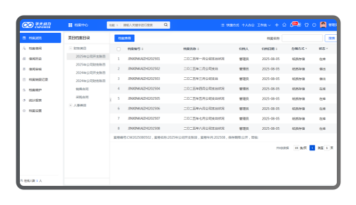 企业各类档案分类存储、检索、借阅、归还全流程管理,支持按档案类型、部门、年份分级归档,权限分级管控不同岗位访问权限,全文关键词检索快速定位目标档案,借阅记录全程追溯可查。