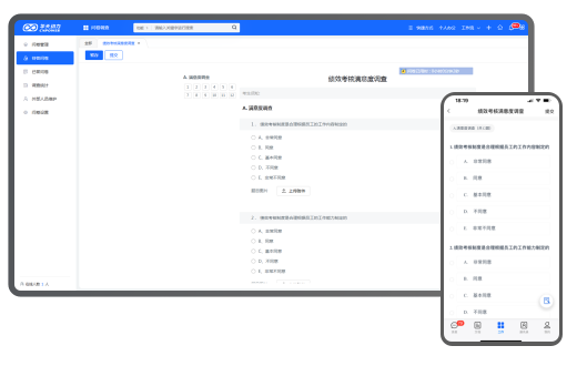 支持自定义创建试卷,设置考试时长、防作弊规则,员工在线答题后客观题自动阅卷评分,主观题支持线上评卷,自动生成个人成绩与部门/岗位考核报表,适配内部培训考核与技能测评需求。