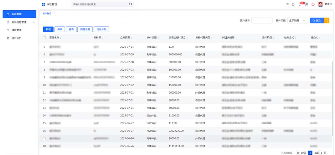案件登记:此功能允许用户基于案件表单定制案件提醒、任务分配和统计分析。这有助于跟踪案件进度,确保所有相关任务按时完成,并提供案件处理的可视化数据支持决策。